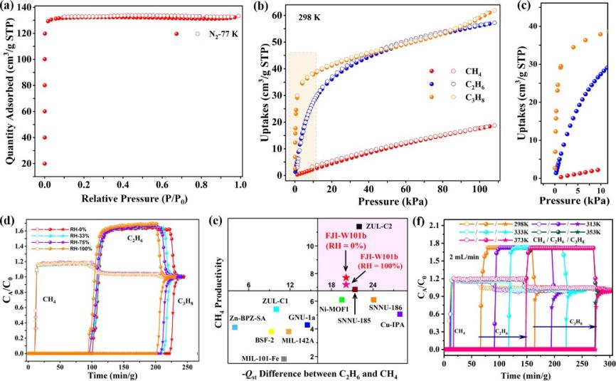 基于此,中国科学院福建物质结构研究所吴明燕研究员团队成功设计并合成了一种具有水缓冲功能的MOFs材料。该材料在水分子吸附/脱附过程中表现出独特的单晶-单晶可逆结构转变特性,使其在潮湿环境下仍能维持优异的分离性能。通过单晶X射线衍射分析发现,水合相FJI-W101a与脱水相FJI-W101b之间可通过金属节点配位水的可逆得失,实现二维层状结构与三维框架结构的动态转换。虽然FJI-W101a与FJI-W101b具有不同的结构,但两者均对体积较大的C3H8和中等尺寸的C2H6分子表现出显著的选择性吸附能力,而对CH4的吸附量却很低。该材料的独特性能使其适用于潮湿环境下的管道天然气纯化。突破分离实验表明,即使在100%相对湿度条件下,FJI-W101b仍能高效分离CH4/C2H6/C3H8(85/7.5/7.5,v/v)三元气体混合物,并以7.2 mmol·g?1的高产率获得高纯度CH4。此外,通过程序升温调控,研究人员开展了一系列原位吸附和突破分离实验,证实了水合相FJI-W101a在潮湿环境下对C2H6和C3H8同样具有优异的吸附分离能力。经原位加热活化,FJI-W101a可完全转化为FJI-W101b,突破分离实验表明其分离性能与新鲜制备的材料一致,验证了此类水缓冲材料用于天然气纯化的可行性。