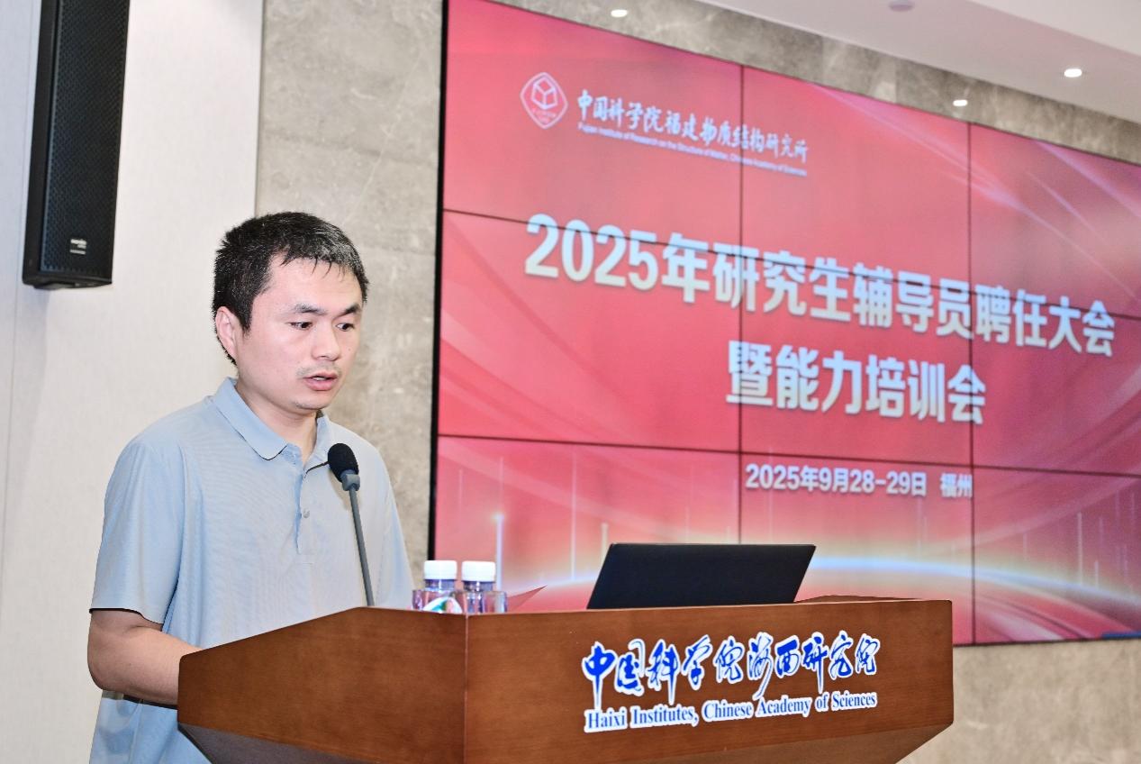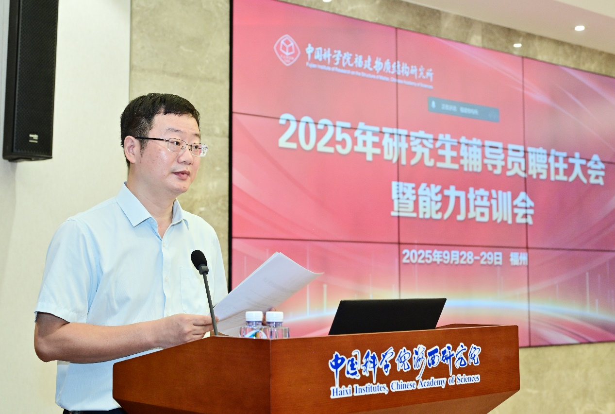 9月28日至29日,福建物构所在嘉锡楼举办2025年研究生辅导员聘任大会暨能力培训会。中国科学院大学学工部部长王岗(线上),福建物构所党委书记、副所长张健,所务委员吴少凡,闽江学院学工部部长杨晓,高校辅导员代表,全体新入职辅导员及教育处全体成员参加会议?;嵋橛山逃ΥΤふ沛褐鞒?。